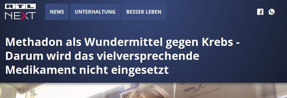 Im Jahr 2009 fand eine Forscherin am Universitätsklinikum in Ulm in Deutschland, dass Methadon zusammen mit einer Chemotherapie in einigen Fällen viel stärker auf Krebszellen eingewirkt hat, als wäre kein Methadon dazu verabreicht worden. Dieses Mittel ist ja in erster Linie dafür bekannt, als medizinische Ersatzdroge für Süchtige zu wirken und Schmerzen zu lindern. Zahlreiche Medienberichte zeugen von erstaunlichen Heilungen bei Krebsleiden, wie z.B. in diesem Beitrag auf RTL vom 18. Juli 2017: http://rtlnext.rtl.de/cms/methadon-als-wundermittel-gegen-krebs-darum-wird-das-vielversprechende-medikament-nicht-eingesetzt-4120344.html?c=d0ba